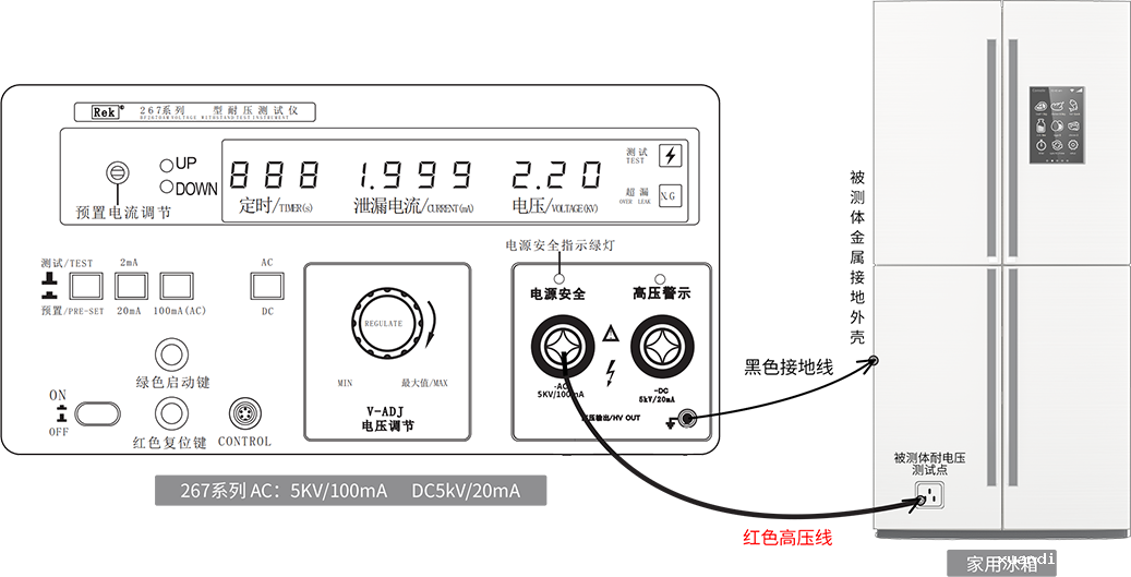 1、将仪器高压输出连接到冰箱电源输入端(L.N并在一起)网电部份。仪器接地端(回路)接到冰箱地端。