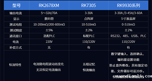 可选仪器:RK2678XM系列(电流30/32/70安培可选),程控机RK7305系列,RK9930系列(电流30/40/60安培可选),程控系列具备PLC信号输出,RS232,RS485通讯功能。