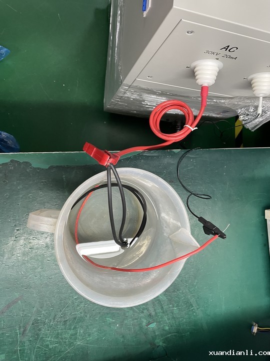 首先是对被测物处理:拿住线材两端剥去2厘米左右长度绝缘层,将两个线芯拧在一起并接到高压输出端上。拿个塑料盆子装盆清水,把线材放入水中(线芯不要沾到水),把仪器回路端放到清水中。接线完成打开仪器开关,慢慢调节电压,观察电流上升情况。如线材绝缘性能不好,电流会不断上升,最终触发报警产品不合格。
