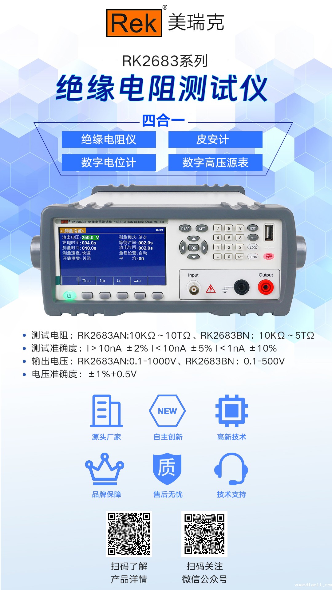 RK2683系列:该系列绝缘电阻测试仪测试电压(1V-1000V)符台GB4706.1.其这得电阻测式范围最大可达到(10K-10T).RK2683系列可满足大部分家用电器的绝络电缘测试要求