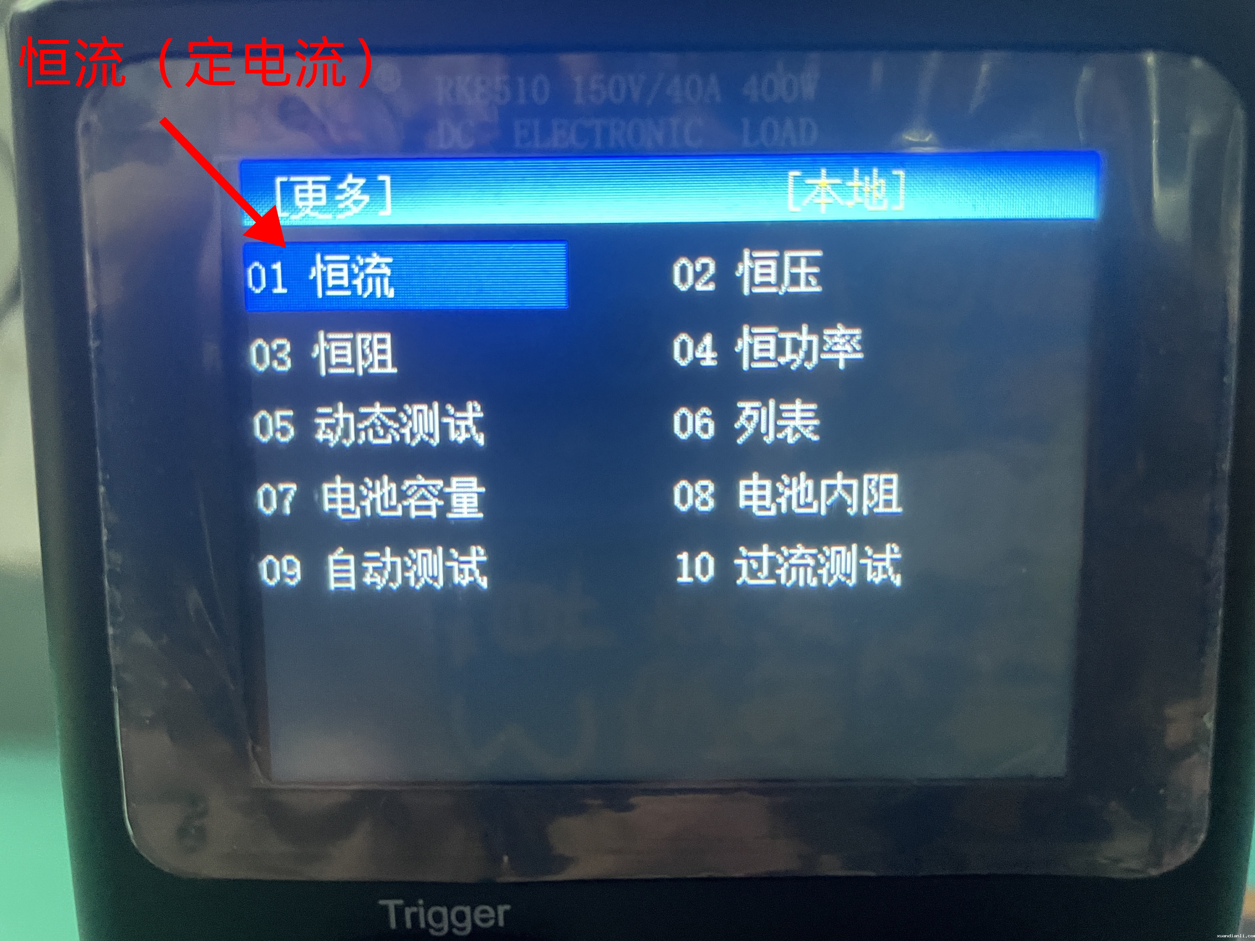 接线完成打开仪器,点击Mode按键,进入产品的模式选择界面,RK8510拥有定电流、定电压、定电阻模式,通过方向按键选择对应模式,首先我们选择定电流模式点击OK按键进入定电流界面,点击OK按键在设置栏调整电流值,调整好电流后按ON进行测试。按相同方法可以测试定电压、定功率功能。